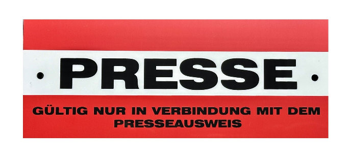 kann mit Saugnäpfen an der Innenseite der Windschutzscheibe befestigt werden. Es ist für alle Journalist:innen im Einsatz mit dem Auto gedacht, um auf die berufliche journalistische Tätigkeit hinzuweisen, was bei diversen Terminen auf ein gewisses Entgegenkommen beim Parken hoffen lässt.
