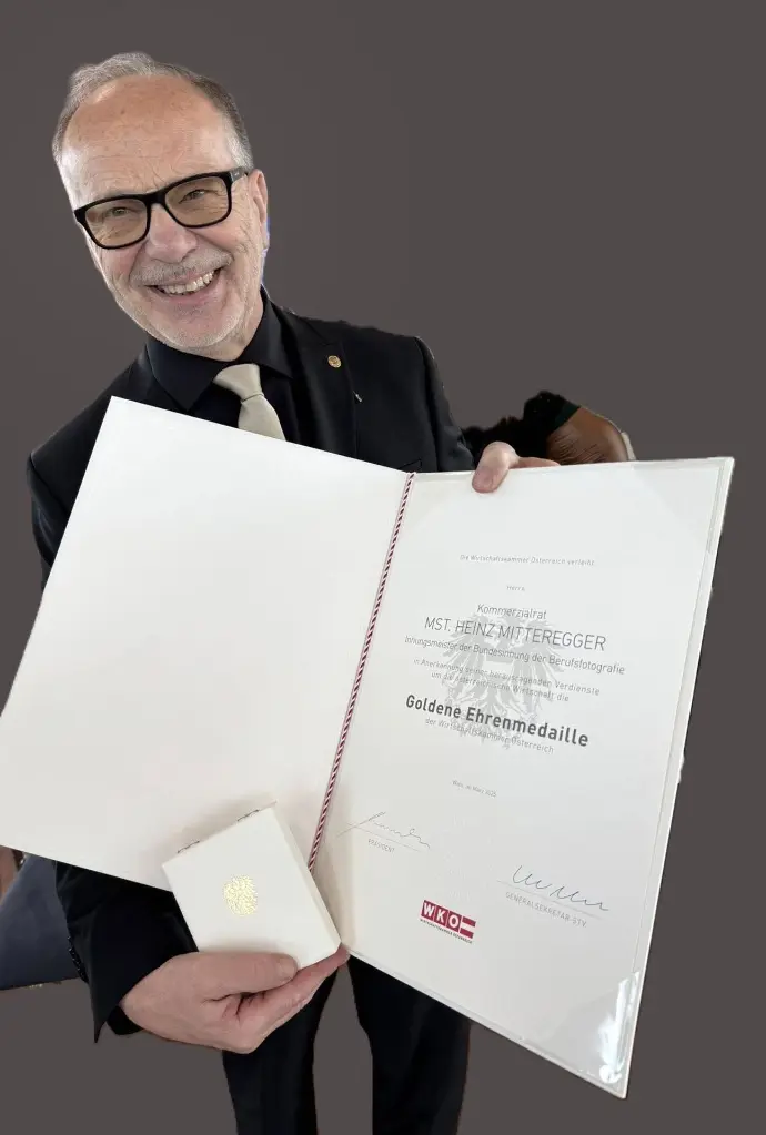 Die WKO - Wirtschaftskammer Österreich vergab daher als Premiere eine Auszeichnung in Gold für Heinz Mitteregger, für besondere Verdienste um Kammer, Sparte und deren Mitglieder - somit auch darüber hinaus für Verdienste um die Fotografie schlechthin.