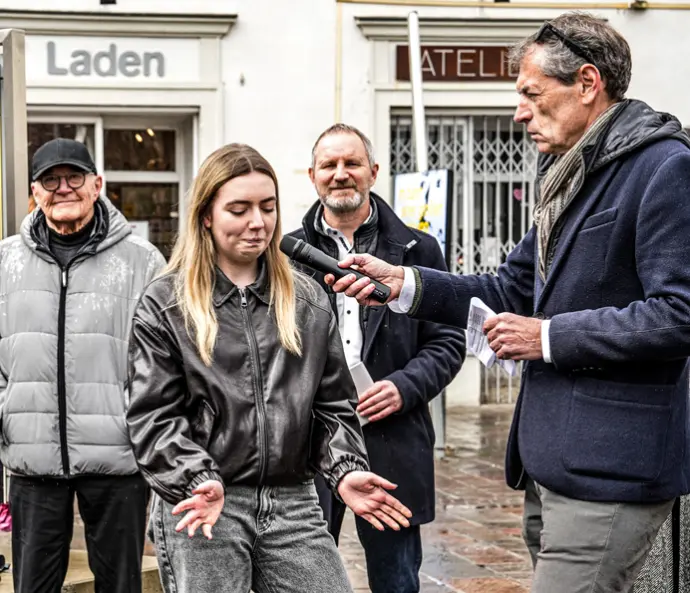 3. Lena Satzer würde gerne als Fotografin unter inzwischen 1500 anderen Fotograf:innen bestehen wollen (ja, die Zahl hat in der Steiermark um 300 Prozent zugenommen!) – ihre Geste mit leeren Händen beim Interview mit Christian Jungwirth bedeutet aber noch Unsicherheit . . .